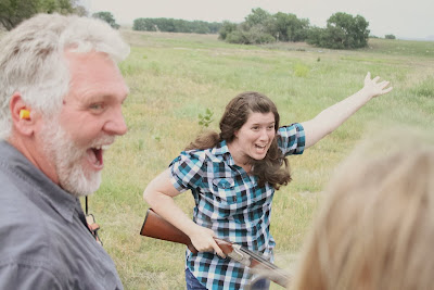 We spent the afternoon shooting clay pigeons with some friends. It was the first time the girls & I shot big guns. And we had a BLAST! The girls were mostly in charge of pulling the traps. (They loaded the machines with "clay pigeons"--which look like the saucers on terra cotta pots, only painted orange--& then they pull a lever which makese them fling up really high in the sky.)